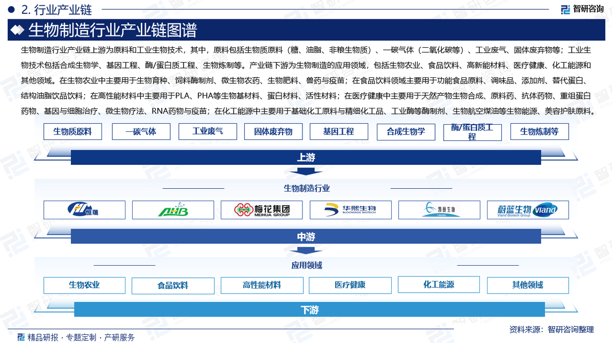 生物制制行业财产链上逛为原料和工业生物手艺,此中,原料包罗生物质原料(糖、油脂、非粮生物质)、一碳气体(二氧化碳等)、工业废气、固体烧毁物等;工业生物手艺包罗合成生物学、基因工程、酶/卵白质工程、生物炼制等。财产链下逛为生物制制的使用范畴,包罗生物农业、食物饮料、高新能材料、医疗健康、化工能源和其他范畴。正在生物农业中次要用于生物育种、饲料酶制剂、微生物农药、生物肥料、兽药取疫苗;正在食物饮料范畴次要用于功能食物原料、调味品、添加剂、替代卵白、布局油脂饮品饮料;正在高机能材猜中次要用于PLA、PHA等生物基材料、卵白材料、活性材料;正在医疗健康中次要用于天然产品生物合成、原料药、抗体药物、沉组卵白药物、基因取细胞医治、微生物疗法、RNA药物取疫苗;正在化工能源中次要用于根本化工原料取精细化工品、工业酶等酶制剂、生物航空火油等生物能源、美容护肤原料。